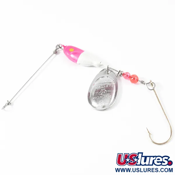 Nikkelipintaisessa lipassa on selkeä leima tälle South Bendin valmistamalle Walleye Wonder 3 -vieheelle, tuotekoodi 3572. Painoltaan 17g (3/5oz) olevassa vieheessä on erottuva kaksivärinen pää, jonka kirkkaan vaaleanpunainen etuosa vaihtuu valkoiseen takaosaan, viimeisteltynä pienellä keltaisella silmätäplällä. Rakenne noudattaa klassista hakaneula-tyyppistä spinnerbait-muotoilua, joka on peräisin USAsta. Koon 3 lipan ja suuren yksittäiskoukun välisessä lankarungossa on kaksi fasetoitua oranssinpunaista helmeä ja pieniä nikkelisiä välilevyjä. Tämä yksilö on erinomaisessa kunnossa (arvosana 5/5), ja siinä on puhdas maalipinta sekä kirkkaat metalliosat. Lippaan syvään upotettu logo on terävä ja luettavissa, mikä heijastaa South Bendin vintage-kalastusvälineiden valmistuslaatua.