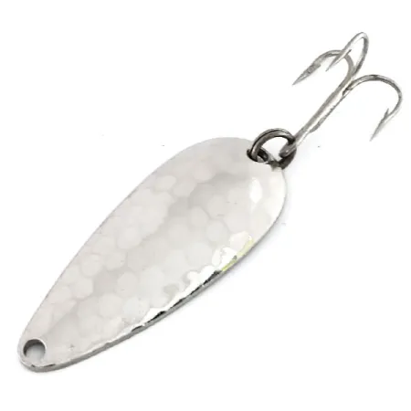 Tämän vintage-lusikkauistimen vasaroitu nikkelipinta on suunniteltu heijastamaan valoa useisiin suuntiin vedenpinnan alla. Pituudeltaan 4,5 cm (1 3/4") ja painoltaan 7 g (1/4 oz) oleva uistin (tuotekoodi 9717) edustaa vuosisadan puolivälin amerikkalaisille kalastusvälineille tyypillistä suoraviivaista toimivuutta. Vieheen kääntöpuolella on sileään, kiillotettuun takapintaan syvään leimattu WEBER-tuotemerkki, mikä on Stevens Pointissa, Wisconsinissa tapahtuvan valmistuksen tavaramerkki. Pisaran muotoon yhdistyy yksi kiinnitysreikä yläosassa ja vahva uistinrengas, joka pitelee alkuperäistä kolmihaarakoukkua pyrstössä. Kunto on 5/5, ja pinnoite on pysynyt kirkkaana ja heijastavana ilman merkittäviä kulumisen tai tummumisen merkkejä. Tämä rakenne on optimoitu perinteiseen heittokalastukseen, jossa valon heijastuminen toimii tärkeimpänä houkuttimena.