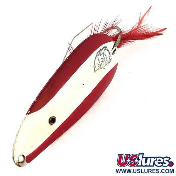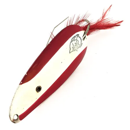 Eloisat punaiset ja valkoiset raidat kuperalla pinnalla määrittelevät tämän legendaarisen Eppinger-sarjan 21g (3/4oz) lusikkauistimen. Tarkalleen 7cm (2 3/4") pituinen Weedless Dardevle Dardevlet, tuotekoodi 12702, kantaa klassista paholaisen pää -grafiikkaa, joka on painettu suoraan valkoiseen maaliin. Eppinger on valmistanut näitä Michiganissa vuodesta 1906, ja tämän nikkelitaustaisen mallin vankka rakenne on osoitus heidän valmistusstandardeistaan. Tämä versio on suunniteltu erityisesti tiheään kasvustoon, ja siinä on kaksihaarainen ruohosuojus, joka suojaa yksihaarakoukkua tarttumasta kasvillisuuteen. Koukun varteen on sidottu tukevasti karmiininpunainen höyhenpyrstö, joka antaa pehmeän tekstuurin kiillotettua nikkelisisustaa vasten. Nykyisessä 5/5-kunnossa maali on pysynyt kirkkaana ja metallipinnat säilyttävät korkeakiiltoisen hohdon. Alkuperäinen kiinnitysreikä kapeassa päässä on valmis uistinrenkaalle, ja se on sijoitettu pitämään viehe vakaana hitaassa kelauksessa lumpeiden tai uppopuiden seassa.