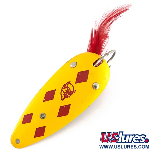 Erottuva punainen vinoneliökuvio eloisan keltaisella pohjalla tunnistaa tämän "Five of Diamonds" -kuvion välittömästi klassiseksi Eppinger-paletiksi. Pituudeltaan 7 cm (2 3/4") ja painoltaan 21 g (3/4 oz) oleva yksilö on Dardevlet-malli, monikäyttöinen keskikokoinen valinta erilaisiin vesiolosuhteisiin. Tässä versiossa on ruohosuojattu rakenne, johon kuuluu kaksilankaisella suojuksella varustettu yksittäiskoukku koristeltuna kirkkaanpunaisilla höyhenillä. Osat ovat tiukasti kiinni, ja punaiset höyhenet ovat tuuheat ja hyvin säilyneet. Messinginsävyiseen kääntöpuoleen selvästi leimattu ikoninen paholaisenpää-logo vahvistaa sen perinnön Lou Eppingerin vuonna 1959 Dearborniin, Michiganiin siirtämästä yrityksestä. Tämä 5/5-luokiteltu uistin on erinomaisessa kunnossa, ja siinä on puhdas, kiiltävä etupuoli ja kirkas, hapettumaton tausta. Tuotekoodi 7907 tunnistaa tämän raskaan lusikkauistimen, joka on suunniteltu kulkemaan kasvillisuuden läpi, jossa tavalliset koukut tarttuisivat kiinni.
