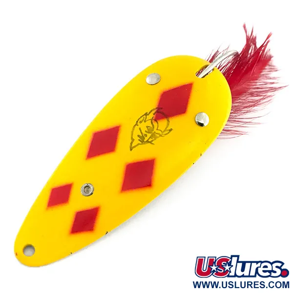 Viisi punaista ruutu-kuviota erottuvat selvästi tämän 21 g (3/4 oz) lusikkauistimen kirkkaankeltaisesta emalipinnasta. Keräilijät tuntevat tämän värityksen «Five of Diamonds» -kuviona. Eppingerin USA:ssa valmistama Weedless Dardevle Dardevlet (tuotekoodi 9317) on 7 cm (2 3/4") pitkä, ja sen kuperalla puolella on merkin tunnusomainen paholaisenpää-logo. Messinkiseen kääntöpuoleen on selvästi leimattu Dardevle-nimi ja alkuperämaa. Tässä nimenomaisessa mallissa on yksi koukku, jota suojaavat kaksinkertaiset metalliset ruohosuojat, ja sitä on tehostettu kirkkaanpunaisella höyhenperällä. Viehe on 5/5-kunnossa; maalipinta on upeasti säilynyt ja metallinen tausta on puhdas. Suunniteltu heitettäväksi tiheään kasvustoon, ruohosuojattu rakenne on suora ja toimiva, valmiina vaikeisiin olosuhteisiin.