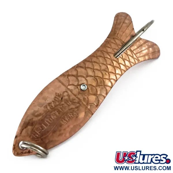 Kupariviimeistelyyn on selkeästi leimattu klassinen 'TRADE HELLION FISH MARK' -brändäys, joka tunnistaa tämän vintage-lusikan. Weedless Hellion Fish Crystal, tuotekoodi 9729, on pituudeltaan 2 3/4" (7 cm) ja painoltaan 2/5 oz (12 g). Sen huomattavin piirre on keskitetty 'Crystal'-silmä, pieni upotettu lasijalokivi, joka erottuu metalliin pakotetusta yksityiskohtaisesta suomukuviosta. Tämä amerikkalaisvalmisteinen uistin on rakennettu kasvuston seassa kalastamiseen, ja siinä on kestävä lankainen ruohosuoja, joka suojaa integroitua yksihaurakoukkua tarttumilta. Lusikan syvä kaarevuus näkyy sivuprofiilissa, ja siinä on kalapyrstö-siluetti sekä järeä uistinrengas siiman kiinnitystä varten. Tämä kyseinen yksilö on 5/5-kunnossa, ja sen metallirungossa on puhdas, tasainen viimeistely.