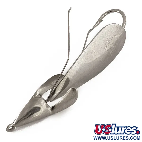 Nikkelöinti peittää Weedless Johnnie O’ Neil Weed Wing 3 -uistimen 7 cm (2 3/4") rungon, jonka muotoilu juontaa juurensa vuoteen 1957 Akronissa, Ohiossa. Tämä 14 g (1/2 oz) painava yksilö (tuotekoodi 11596) on varustettu klassisella siipimallisella lyijypäällä ja stansatulla lehdellä, jonka Johnnie O'Neil patentoi vuonna 1962. Yksittäinen, suuri ylöspäin käännetty koukku on suojattu pitkällä ja joustavalla metallilankaisella ruohosuojalla, joka on suunniteltu tiheään kasvillisuuteen. Uistin on 5/5-kunnossa, metallipinnat ovat poikkeuksellisen puhtaat ja valmistajan leima on selvästi nähtävissä hopeanvärisessä lehdessä. Tämä muotoilu edustaa aikaa ennen uistimen myyntiä Harrison Industriesille 1960-luvun puolivälissä, säilyttäen alkuperäisen amerikkalaisen käsityötaidon. Nokan siimalenkki on täydellisen muotoinen ja lankasuoja on säilyttänyt alkuperäisen jännityksensä koukun kärkeä vasten.
