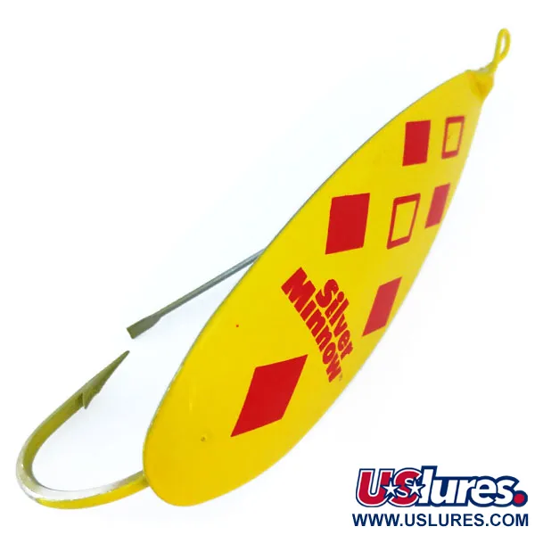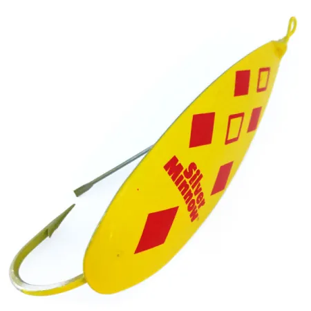 Rohkeat punaiset timantit erottuvat eloisasta keltaisesta taustasta tässä perinteisessä 'Five of Diamonds' -kuvioisessa lusikassa. Tämä 9 cm (3 1/2") pitkä ja 28 g (1 oz) painava kookkaampi yksilö on toimiva esimerkki Louis Johnsonin alkuperäisestä vuoden 1920 suunnittelufilosofiasta. Yhdysvalloissa valmistettu lusikka on valmistettu erityisestä kupari-sinkkiseoksesta, joka on keskeltä paksumpaa. Tämä tarkka painonjakauma mahdollistaa uistimen tasaisen keinuvan liikkeen 270 asteen kulmassa pitäen samalla integroidun suojatun koukun ylöspäin suunnattuna tiheässä kasvustossa navigointia varten. Kääntöpuolella on aito hopeointi, tuotemerkin tunnusmerkki, jota käytetään tuottamaan kirkas välähdys houkuttelemaan kaloja alhaalta ja sivuilta. Tämä nimenomainen malli, tuotekoodiltaan 10964, edustaa perinteisten amerikkalaisten kalastusvälineiden vankkaa rakennetta. Yksilö on 5/5-kunnossa. Tukeva metallinen ruohosuojus suojaa yksittäistä koukun kärkeä estäen tarttumisen kelattaessa tiheiden lumpeiden tai kaislikoiden läpi.