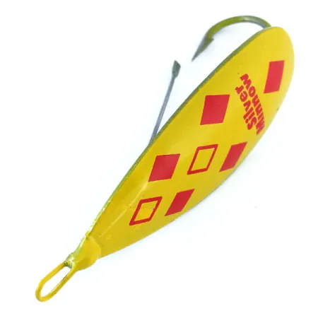 Kirkkaankeltainen viimeistely viidellä punaisella timantilla erottaa tämän Weedless Johnson Silver Minnow -yksilön, tuotekoodi 11066. Kooltaan 7 cm (2 3/4") ja painoltaan 17 g (3/5 oz) oleva lusikkauistin on valmistettu kupari-sinkkiseoksesta. Se on suunniteltu keskeltä paksummaksi, jotta koukku pysyy oikeassa asennossa vedessä. Uistimen taakse on leimattu selkeästi ”JOHNSON'S SILVER MINNOW” ja ”MADE IN U.S.A.”, mikä osoittaa sen olevan aito amerikkalainen vintage-tuote. Ruohosuojattu rakenne perustuu tukevaan metallisuojaan, joka peittää kiinteän yksittäiskoukun, mahdollistaen tehokkaan kalastuksen lumpeikkojen ja kasvuston seassa. Kunnoltaan uistin on 5/5; maalatut pinnat ja metallinen tausta ovat kirkkaat ja selkeät. Tekninen muotoilu antaa uistimen keinua 270 asteen kulmassa luoden voimakkaita välähdyksiä, kun taas keskipainotettu runko takaa vakaan uinnin ilman leikarin tarvetta.