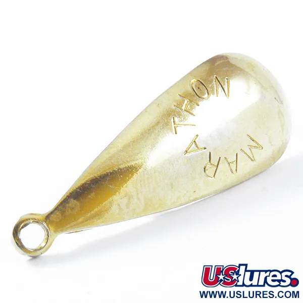 7g (1/4oz) pisaranmuotoiseen runkoon on stanssattu selvästi nimi "MARATHON", joka on Wisconsinissa vuosina 1929–1979 toimineen Marathon Bait Companyn tunnusmerkki. Tässä Weedless Marathon -uistimessa, tuotekoodilla 3375, on kiillotettu kultaviimeistely 4,5 cm (1 3/4") rungossa. Jotta se liikkuisi tiheän kasvuston läpi tarttumatta kiinni, rakenteessa on yksihaarakoukku, jota suojaa metallilangasta tehty ruohosuoja pienellä vaaleanpunaisella helmellä. Tämä yksilö on erinomaisessa kunnossa, ja siinä on tallella alkuperäinen kiilto ilman kulumisen merkkejä, mikä oikeuttaa 5/5-kuntoarvioon. Rakenteessa on vankka, integroitu siimalenkki kapeassa päässä, mikä on tyypillistä Marathonin viisikymmenvuotisen historian aikana Yhdysvaltain Keskilännessä valmistamille kestäville kalastusvälineille.