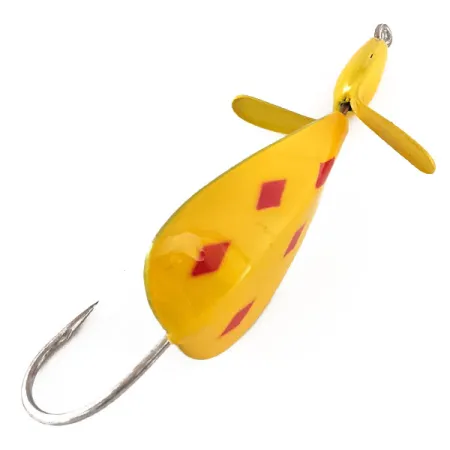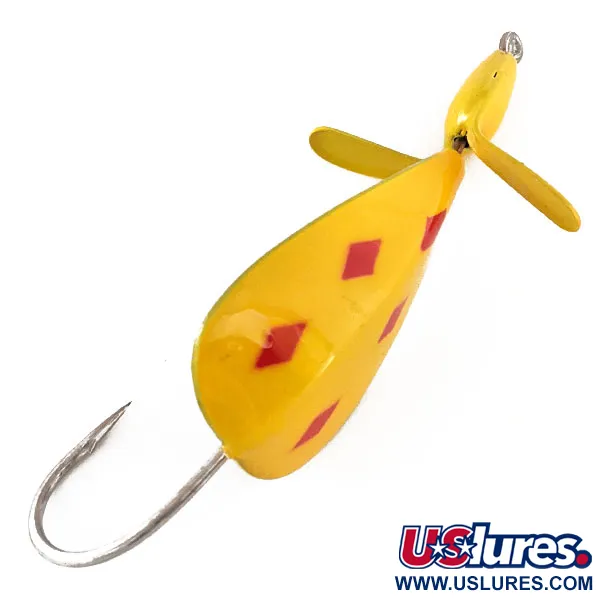 Five of Diamonds -kuviointi — klassinen keltainen pohja, jossa on neljä punaista vinoneliötä lipassa ja yksi päässä — tunnistaa tämän Weedless Panther Martin Weed Wing -vieheen. Tiheässä kasvustossa kalastamiseen suunnitellussa vieheessä on suuri yksihaarakoukku pisaranmuotoisen rungon takana. Keltaiseksi maalattu metallipotkuri on asennettu kärkeen luomaan pintavärinää keräämättä kasvillisuutta. Tämän mallin tuotekoodi on 11398, se painaa 1/2 oz (14 g) ja on 2 3/4" (7 cm) pitkä. Vieheen kääntäminen paljastaa puhtaan, maalaamattoman hopeisen metallipinnan alapuolella, mikä luo kontrastia kirkkaalle yläpuolelle. Valmistettu USA:ssa, tämä yksilö on käyttämätön ja erinomaisessa kunnossa.