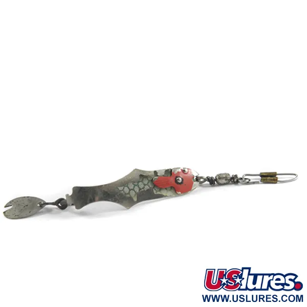 Nikkelipinnoite peittää tämän 3 cm (1 1/4") lusikan rungon, jota korostavat erottuva punainen pää ja metalliin syövytetty hienovarainen suomukuvio. Tuotekoodilla 2435 luetteloitu Weedless Pflueger Wobbler on varustettu toimivalla lankaisella ruohosuojalla, joka on kiinnitetty näkyvällä ruuvilla alapuolelle – tämä on Pfluegerin mekaaninen ratkaisu tarttumisvapaaseen kalastukseen. USA:ssa valmistettu, kevyt 1,4 g (3/64 oz) yksilö on 4/5-kuntoinen, ja varusteet, mukaan lukien etuleikari ja lukkoliitin, ovat edelleen tukevasti kiinni. Peräosaan on kiinnitetty pieni, terälehden muotoinen lippa, joka tuo kalastajalle toissijaisen liikepisteen. Taustapuolen leimaus on säilynyt erittäin selkeänä, ja kiillotetulla metallipinnalla näkyvät tunisteet 'MADE IN USA' ja 'PFLUEGER WOBBLER'.