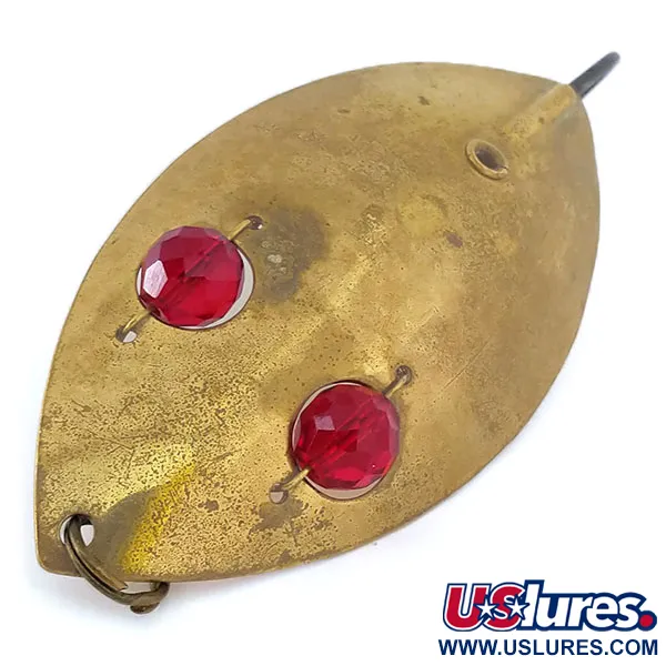 Tämä raskas lusikkauistin on viimeistelty klassisella pronssimessingillä ja painaa 2 1/4 oz (65 g). Tämä USA:ssa valmistettu Hofschneiderin Weedless Red Eye Muskie, tuotekoodiltaan 10850, on pituudeltaan huomattavat 4 3/4" (12 cm). Rakenne keskittyy leveään metallirunkoon, jota korostavat kaksi näkyvää, viistettyä punaista lasihelmeä, jotka heijastavat valoa ja herättävät huomiota vedessä. Suunniteltu erityisesti ruohikkoiseen kalastukseen, tässä mallissa on integroitu yksihaurakoukku, jota suojaa ruohosuojalanka helpottaen kalastusta tiheän kasvuston läpi. Metallipinnassa on luonnollista ikääntymistä, joka vastaa 4/5-kuntoarviota, säilyttäen sen rakenteellisen eheyden ja erottuvan estetiikan. Sen muotoilu on räätälöity hitaisiin uittoihin, jolloin lasisilmät pysyvät petokalojen näkyvissä kelauksen aikana. Etureunassa on tukeva metallirengas siiman varmaa kiinnitystä varten.
