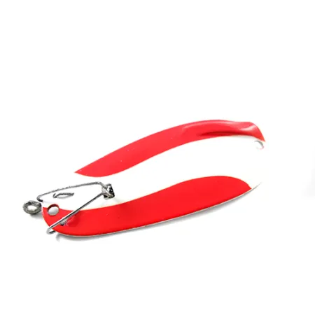 Nikkelipinnoite muodostaa pohjan tälle Suomessa valmistetulle 7g (1/4oz) lusikkauistimelle, tarjoten suuren kontrastin sen kirkkaanpuna-valkoiselle yläpuolelle. Kääntöpuolelle on selvästi leimattu Scorpion-tuotemerkki sekä ”Made in Finland” ja US Patent 3048938, mikä merkitsee sen erikoistuneeksi ruohosuojatuksi vieheeksi. Tässä mallissa, tuotekoodiltaan 1863, on lankasuojamekanismi, joka on suunniteltu suojaamaan koukun kärkeä heitettäessä lumpeiden tai tiheän kasvuston sekaan. Metallirunko on 5 cm (2") pitkä ja se on säilynyt 4/5-kunnossa, pinnoitteen ollessa kirkas ja ehjä. Muotoiluun kuuluu suoraan kärkeen kiinnitetty integroitu lukkoleikari, joka mahdollistaa varman kiinnityksen tekniseen kalastukseen paksun kasvuston keskellä.