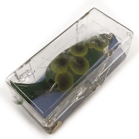 Syvän metsänvihreä pohja toimii pohjana ikoniselle Frog-kuviolle, jossa keltaisella reunustetut tummat täplät luovat voimakkaan visuaalisen kontrastin kasvillisuuden seassa piileskeleville bassoille. Painoltaan 12,5 g (2/5 oz) tämä Weezel Rex Weedless Spoon on käyttämättömässä kunnossa ja se on säilynyt erinomaisesti alkuperäisessä kirkkaassa muovikotelossaan. 5,5 cm (2 1/4") metallilevyssä on erottuva yksittäiskoukku, jota suojaa jousiteräksinen ruohosuoja – suunnittelun tavaramerkki, joka teki Weezel Bait Co:sta johtajan tiheässä kasvustossa kalastamisessa ennen kuin Eppinger lopulta osti tuotemerkin. Koukkuun on sidottu tummanvihreä höyhenperho, joka lisää pehmeää, luonnollista tekstuuria vieheeseen. Keräilijät tunnistavat tuotekoodin 11661, joka liittyy tähän erityiseen Yhdysvalloissa valmistettuun versioon. Viimeistely on huomattavan puhdas, mikä osoittaa varhaisen amerikkalaisen kalastusvälinetuotannon korkealaatuista ammattitaitoa.