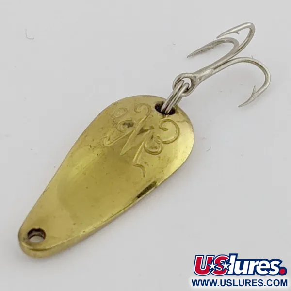 Kuperalla puolella oleva koristeellisella kirjasimella leimattu ”W” tunnistaa tämän 1/8 oz (3,5 g) lusikkauistimen aidoksi Weller Gypsy King Deluxe -malliksi. Pieni pisaranmuotoinen runko on 1 tuuman (2,7 cm) pituinen, ja siinä on lämmin messinkiviimeistely, joka pysyy kirkkaana ja heijastavana. Tuotekoodilla 24521 luetteloitu metalliuistin osoittaa tarkkaa stanssausta ja sileitä reunoja, jotka ovat tyypillisiä vuosisadan puolivälin amerikkalaisille kalastusvälineille. Yksi kolmihaarakoukku on kiinnitetty suoraan umpimetallisen rungon takasilmukkaan. Tämän yksittäisen kappaleen kuntoluokitus on 5/5, eikä sen kiillotetuissa pinnoissa tai kaiverretuissa yksityiskohdissa ole merkittävää kulumista.