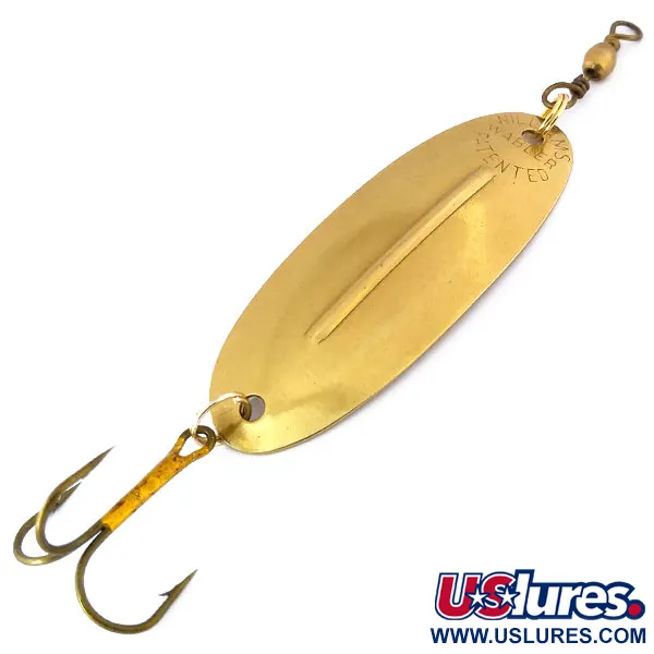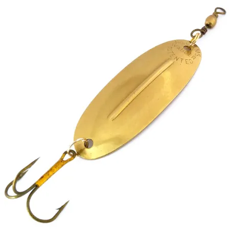 Tämä messinginvärinen Williams Wabler W50 on pituudeltaan 6,7 cm (2 3/4"), ja siinä on merkille tunnusomainen pituussuuntainen harjanne, joka on määritellyt brändiä sen alkuvuosista 1920-luvulta lähtien. Tämä Kanadassa valmistettu klassikko painaa 14 g (1/2 oz), ja sen kuperalla puolella on selvästi näkyvä "WILLIAMS WABLER PATENTED" -leima. Vaikka monet Williams-uistimet tunnetaan hopeoinnistaan, tässä yksilössä on lämmin messinkipinta, joka on perinteinen valinta hauen ja kuhan kalastukseen vaihtelevissa valo-olosuhteissa. Vakauttava harjanne on toiminnallinen muotoiluelementti, jonka tarkoituksena on ylläpitää tasainen uintiliike sekä hitaassa että nopeassa kelauksessa. Tätä teknistä ominaisuutta yritys hienosääti siirrettyään koko tuotantonsa Kanadaan vuonna 1978. Varustukseen kuuluu vankka kolmihaarakoukku ja messinkinen tynnyrileikari, jotka molemmat ovat erinomaisessa kunnossa (luokitus 5/5). Tuotekoodi 10534 yksilöi tämän nimenomaisen W50-version, joka on edelleen pohjoisamerikkalaisten metalliuistinten keräilijöiden suosiossa. Pinta heijastaa valoa puhtaasti korostaen ominaista soikeaa muotoa, joka on säilynyt lähes muuttumattomana yli vuosisadan ajan.