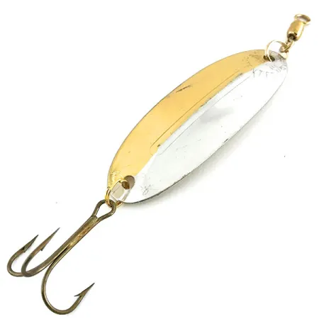 Tämän kanadalaisvalmisteisen lusikkauistimen pituus on 2 3/4" (6,7 cm), ja sen tunnusomainen pitkittäinen harjanne on Williams Wabler W50 -muotoilun tavaramerkki. Tämä nimenomainen yksilö, tuotekoodiltaan 8674, esittelee klassisen kulta-hopea-viimeistelyn, mikä heijastaa yhtiön perinnettä käyttää aitoa jalometallipinnoitetta näkyvyyden varmistamiseksi syvässä tai sameassa vedessä. Painoltaan 1/2 oz (14 g) oleva Wabler on suunniteltu vakaaksi sekä heittoalastuksessa että uistelussa, mikä on sen vakauttavan ohjausuran ansiota. Taustapuolen leima vahvistaa sen kanadalaisen alkuperän, jonne Williamsin tuotanto on keskittynyt vuodesta 1978 lähtien. Vieheen kunto on erinomainen 5/5; se on erittäin siisti, siinä on kirkas, heijastava pinta ja vahvat kolmihaarakoukut. Se edustaa palan kalastushistoriaa, joka on säilynyt lähes muuttumattomana perustamisestaan lähtien, ja on edelleen suosittu valinta hauen ja kuhan kalastukseen.