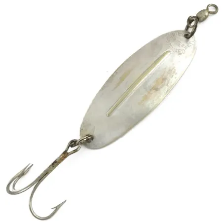 Aito hopeointi peittää tämän 8,3 cm (3 1/4") lusikkauistimen messinkirungon. Kyseessä on klassinen kanadalainen malli, joka on kestänyt aikaa. Tuotekoodilla 9357 rekisteröity Williams Wabler W60 painaa 21 g (3/4 oz) ja on säilyttänyt rakenteellisen eheytensä 4/5-kuntosuosituksella. Terän keskellä kulkee selkeä pitkittäinen harjanne, joka on suunniteltu vakauttamaan uintia eri kelausnopeuksilla. Pääpuoli on varustettu leikarilla ja peräpäässä on suuri kolmihaarakoukku, mikä tekee siitä vankan valinnan hauen ja kuhan kalastukseen. Valmistajan leima löytyy metalliin lyötynä yläreunan läheltä, mikä vahvistaa sen alkuperän.