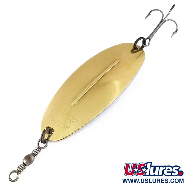 Tunnusomainen pitkittäisharjanne määrittelee tämän 10 cm (4") kultapintaisen lusikan profiilin. Tämä tuotekoodilla 10713 tunnistettu Williams Wabler W70 edustaa käsityötaitoa, joka alkoi Buffalossa vuonna 1914 ennen tuotannon siirtymistä Kanadaan. Painoltaan 28 g (1 oz) raskas rakenne on pinnoitettu täyteläisellä kultasävyllä, ja se on säilynyt 5/5-kunnossa kirkkaalla ja puhtaalla pinnalla. Etupuolen stanssattu merkintä on pysynyt terävänä ja luettavana, mikä on osoitus laadukkaasta valmistuksesta. Tämä malli on suunniteltu säilyttämään vakaus sekä nopeassa että hitaassa kelauksessa – tekninen saavutus, joka on saavutettu sen ainutlaatuisen rakenteellisen harjanteen avulla. Se on varustettu suurella kolmihaarakoukulla ja leikarilla, ja se on suunniteltu suuren hauen tai kuhan kalastukseen. Vuodesta 1978 lähtien nämä vieheet on valmistettu yksinomaan Kanadassa, ja tämä yksilö edustaa tätä pitkäaikaista metallintyöstön huippuosaamista. Kultainen viimeistely tarjoaa hyvän näkyvyyden erilaisissa vesiolosuhteissa ja on säilynyt moitteettomassa kunnossa.