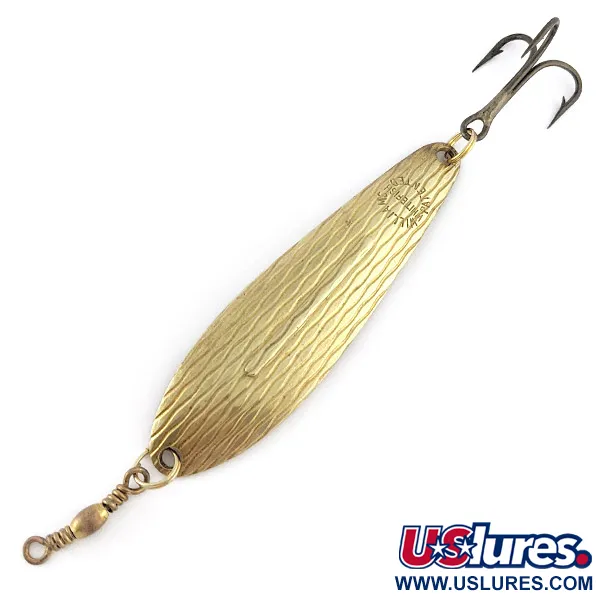 Williams Whitefish C60 -lusikkauistimen (tuotekoodi 23400) tunnusomaiset aaltomaiset pitkittäisharjanteet ovat kanadalaisen uistinmuotoilun tavaramerkki, joka on suunniteltu maksimoimaan valon heijastuminen. Tämän vintage-lusikan pituus on 8 cm (3 1/4") ja paino 14 g (1/2 oz). Messinginsävyinen metallipinta on erittäin puhdas ja hyvin säilynyt, vastaten kuntoarviota 5/5. Takalenkin lähellä on selkeä pyöreä stanssaus, jossa näkyy Williams-nimi ja Whitefish-mallimerkintä. Uistimen osat ovat alkuperäiset, mukaan lukien pronssattu kolmihaarakoukku ja nokkaan asennettu leikari, joka estää siiman kiertymistä. Pitkänomainen ja kapea profiili on klassinen valinta kalastajille, jotka tavoittelevat järvilohta tai haukea syvemmistä vesikerroksista.