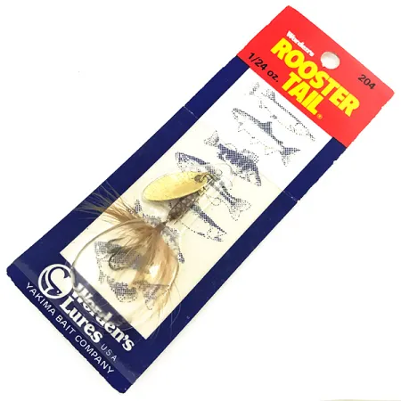 Vain 1/24 oz (1,18 g) painava Yakima Baitin vintage-viehe on varustettu kiiltävällä kultaisella pajunlehtilipalla ja luonnonruskealla höyhenpyrstöllä. Tuotekoodilla 6796 tunnistettu viehe (alkuperäisessä kortissa merkintä 204) on säilynyt klassisessa punasinisessä Worden's Rooster Tail -pakkauksessaan. Howard Wordenin kehittämä in-line-lippa on suunniteltu ultrakevyeen virvelöintiin tai perhovavalla kalastukseen, tehden siitä perusvieheen taimenelle ja muille pienemmille kaloille pikkupuroissa. Tämä yksilö on käyttämätön, kuntoluokitus on 6, ja höyhenet sekä runko ovat täsmälleen siinä kunnossa kuin ne lähtivät Yakima Bait Companyn tehtaalta Grangerista, Washingtonista. Kortin kääntöpuolella on erityissuosituksia kevyeen spinnaukseen ja koho-ongintaan, mikä korostaa tämän höyhenpyrstöisen vieheen monipuolisuutta lajeille kuten aurinkoahven ja crappie. Kultainen lippa ja huolellisesti sidottu höyhen edustavat korkeaa laatua, joka teki brändistä tunnetun tehokkaiden värähtelyjen luojana vedessä.