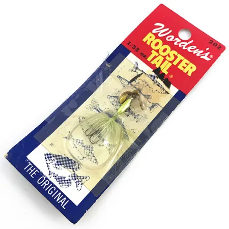 Vain 1/32 unssia (0,9 g) painava ultrakevyt viehe on täydellinen esimerkki finesse-kalastustyylistä, jota Yakima Bait on hionut Worden’s Rooster Tail -sarjallaan. Vieheessä on 1 3/4 tuuman (4,5 cm) runko, kiillotettu kultainen pajunlehtilippa ja käsin sidottu chartreuse-häkiläpyrstö, yhdistelmä on tuotekoodiltaan 6748. Tämä koko on alun perin kehitetty perhovavalla heitettäväksi tai ultrakevyisiin virvelisetteihin, tarkoituksena mahdollistaa hienovaraiset veteen laskeutumiset varovaisia taimenia tai ahvenkaloja pyydettäessä. Rakenne perustuu in-line-lippauistimeen, jossa lippa pyörii keskiakselin ympäri, täydennettynä pyrstön sykkivillä luonnonkuiduilla. Tuote on käyttämätön ja se on yhä suljettuna alkuperäiseen vintage-kuplapakkaukseensa, joka on suojannut kultapintaa ja häkilää ajan kulumiselta. Pahvisessa taustassa on säilynyt ikoninen puna-valko-sininen brändäys ja 202-sarjan merkintä on näkyvissä ylälaidassa.