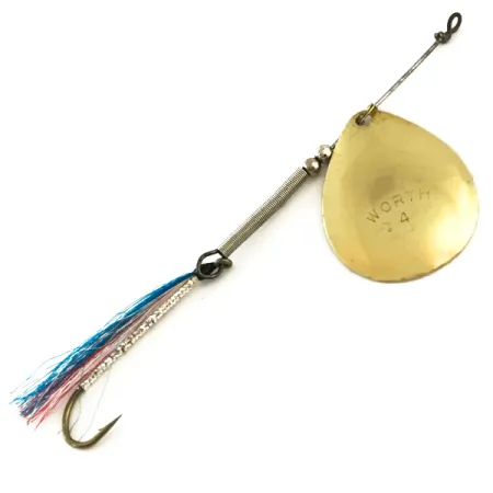 Messinginväriseen lippaan on selkeästi meistetty "WORTH 4" -merkintä, joka tunnistaa tämän klassisen amerikkalaisen lipan. Kalastuskomponenttien laadusta tunnettu Worth-yritys valmisti tämän mallin 6285 kyynelenmuotoisella lipalla, joka pyörii tukevassa lankavarressa. Pituudeltaan 10 cm (4") ja painoltaan 3,5 g (1/8 oz) painavan vieheen runko koostuu erottuvasta metallisesta kierrejousesta ja kahdesta pienestä välihelmestä. Lipan messinkipinta tarjoaa kirkkaan, heijastavan pinnan, joka kontrastoituu perässä tulevan yksihaarakoukun käsin sidottuun tinsel-perhoon. Tämä sidos koostuu sinisistä, valkoisista ja vaaleanpunaisista tinsel-säikeistä, jotka on kiinnitetty mustalla langalla. Nykyisessä kunnossaan vieheen kuntoluokitus on 5/5; lanka ja koukku ovat suorat ja metalliosat kiiltävät upeasti.