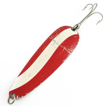 Tämän lusikkauistimen kiillotetulle koveralle puolelle on selkeästi meistetty 'MADE IN USA', ja se edustaa klassista palasta amerikkalaista kalastushistoriaa. Worth Chippewa painaa 21 g (3/4 oz) ja on vankka 9 cm (3 1/2") pituinen heittolusikka. Kuperalla puolella on perinteinen puna-valkoinen raitakuvio nikkelipohjalla, mikä on kalastajien pitkään suosima ja hyvin erottuva väriyhdistelmä. Vieheessä on nähtävissä rehellistä ajan patinaa vieherasiassa vietetyltä ajalta; se on kunnoltaan 4/5, ja siinä on kevyttä pintanaarmua sekä pieniä maalichippejä, jotka korostavat sen ikää. Se on varustettu kestävällä hopeanvärisellä kolmihaarakoukulla ja tukevalla uistinrenkaalla nokassa. Tuotekoodilla 23075 luetteloitu Worthin valmistama yksilö on kestävä taidonnäyte Wisconsinin puolivuosisadan takaisesta käsityöperinteestä.