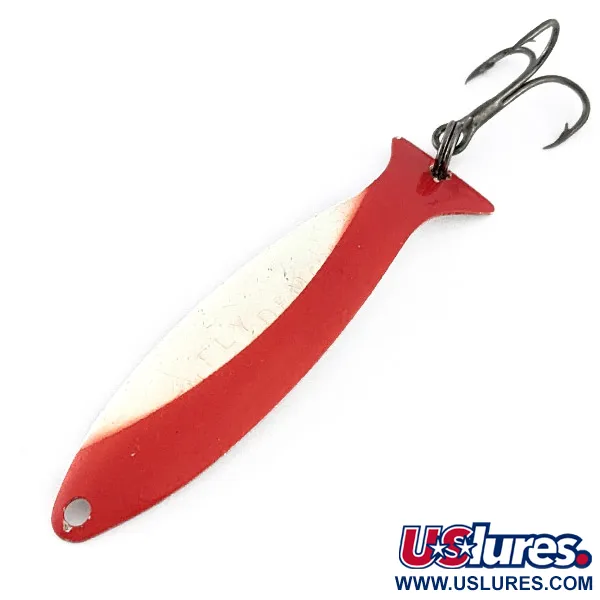 Tämän Worth Fly Rod Demonin, klassisen yhdysvaltalaisen lusikkauistimen, pintaa koristaa kirkas punavalkoinen vinoraitakuvio. Tuotekoodilla 23174 tunnistettava uistin painaa vain 2,5 g (3/32 oz), mikä tekee siitä erinomaisen valinnan perhovavalla kalastaville, jotka tavoittelevat ahventa tai taimenta. Etupuolen valkoiseen emaliosaan on stanssattu selkeä teksti "FLY ROD DEMON". Kääntöpuolella on puhdas, kiillotettu hopeapinta, joka on suunniteltu heijastamaan valoa eri kulmista. Varustukseen kuuluu levenevässä pyrstössä oleva uistinrengas, johon on kiinnitetty terävä, tummasävyinen kolmihaarakoukku. Tämä yksilö on kunnoltaan 5/5; maalipinta on säilynyt kirkkaana ja metallipinnat hohtavat alkuperäistä kiiltoaan. Sen selkeä kalamainen siluetti ja levenevä pyrstöosa ovat ominaisia yhdysvaltalaisen Worth Companyn muotoilulle.