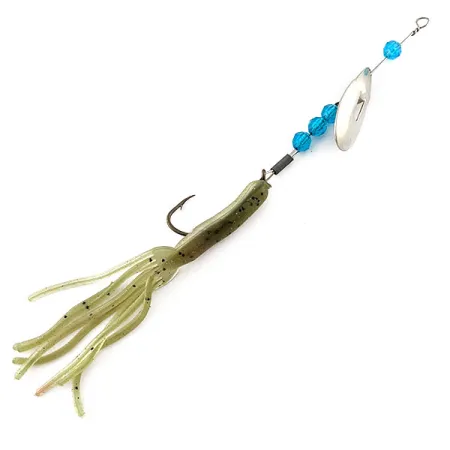 Mallin 20140 visuaalinen ilme rakentuu nikkelin ja sinisen sävyistä, edustaen Worthin klassista amerikkalaista uistinsuunnittelua. Uistin on 11 cm (4 1/4") pitkä ja painaa 6 g (3/16 oz). Siinä on tyypillinen June Bug -rakenne, jossa lippa on kiinnitetty lankavarsiin. Kalastajat arvostavat tätä rakennetta sen luotettavan käynnistymisen vuoksi, mikä varmistaa nikkelöidyn lipan tasaisen pyörinnän ilman jumittumista. Kokonaisuutta korostavat kolme hiottua sinistä helmeä lipan alapuolella ja yksi vastaava helmi siimalenkin lähellä, luoden visuaalista kontrastia metallinhohtoon. Läpikuultava oliivinvihreä jigiperä mustilla hileillä luo hienovaraisen, teksturoidun profiilin rungon perään. Yksihaarakoukku on siististi integroitu pehmeään runkoon, ja uistin on 5/5-kunnossa, pinnat ovat kirkkaat ja materiaalit kauttaaltaan hyvin säilyneet. Worthin muotoilu on kehitetty erityisesti tekniikoihin, jotka vaativat tasaista välkettä ja jatkuvaa pyörintää.