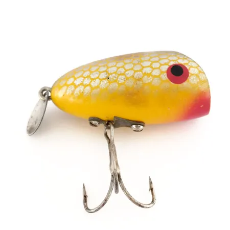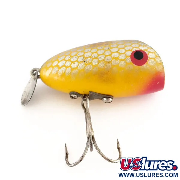 Tämän 4,5 cm (1 3/4") pituisen pintauistimen kompakti profiili on erinomainen valinta kevyeen heittokalastukseen. Wright & McGill Rustler -nimellä tunnettu 10 g (1/3 oz) painava viehe kantaa tuotekoodia 9813 ja se on suunniteltu pintakalvoon tai erittäin matalaan uintiin. Rungossa on kirkkaankeltainen viimeistely hunajakennokuviolla, joka yhdistyy erottuvaan mustaan koveraan etuosaan. Punainen väri peittää leuan ja ympäröi suuret mustat pupillit. Pyrstössä on pieni metallilippa välkettä antamassa, ja vatsapuolen kiinnitys on toteutettu metallilevyllä, jossa on yksi kolmihaarakoukku. Tämä yksilö on luokiteltu 5/5 kuntoon, säilyttäen klassisen yhdysvaltalaisen käsityötaidon estetiikan.