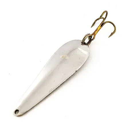 Suoraan kiillotettuun pintaan syövytetty Wright & McGill -nimi edustaa amerikkalaista kalastushistoriaa Denveristä, Coloradosta. Kirkas nikkeliviimeistely peittää Streamliner-uistimen 4,5 cm (1 3/4") pisaranmuotoisen rungon, jonka tuotekoodi on 11641. Kylkeen on leimattu malli ja 7 g (1/4 oz) paino, mikä on selkeä tunnus keräilijälle tai kalastajalle. Alkuperäinen pronssisävyinen kolmihaarakoukku on kiinnitetty tukevasti uistinrenkaalla, ja uistimen yleiskunto on 5/5. Kapean pään siimakiinnitysreikä ja virtaviivainen metalliprofiili on suunniteltu heitto- tai uistinkalastukseen vaihtelevissa olosuhteissa.