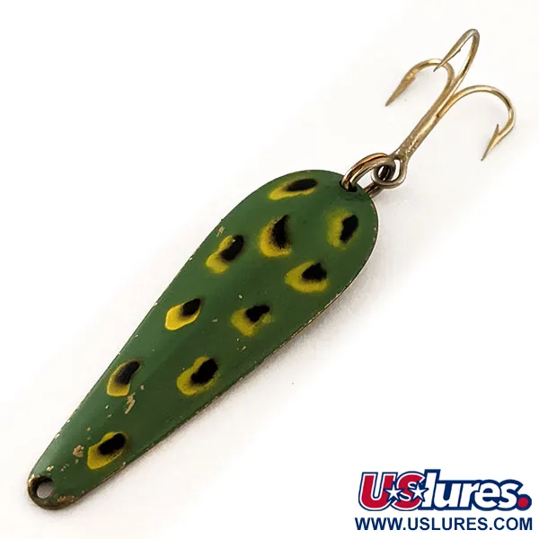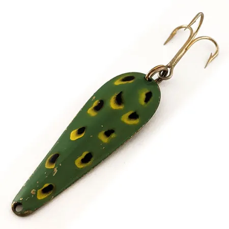 Tämän 4,5 cm:n (1 3/4") kyyneleenmuotoisen lusikkauistimen runko on valmistettu messingistä. Metalliseen taustapuoleen suoraan lyödyt Wright & McGill- ja Streamliner-merkinnät ovat selkeitä ja helppolukuisia, ja ne yksilöivät tämän kappaleen tuotekoodilla 11704. Uistimen etupuolella on perinteinen Frog-kuviointi, jossa tumman oliivinvihreää pohjaa koristavat keltareunaiset mustat täplät matkien luonnollista saaliskalaa. Tässä 7 gramman (1/4 oz) painoisessa uistimessa on kullanvärinen kolmihaarakoukku, joka on kiinnitetty uistimen leveämpään päähän uistinrenkaalla. Tämän yhdysvaltalaisvalmisteisen vieheen kuntoluokitus on 5/5; emalimaali on säilyttänyt alkuperäisen kiiltonsa ja messinginvärinen taustapuoli on puhdas ja kirkas. Metallin kapeneva muoto kohti siimalenkkiä viittaa muotoiluun, joka soveltuu sekä heittokalastukseen että uisteluun erilaisissa makean veden olosuhteissa.
