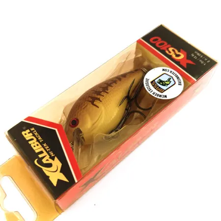 Lämmin kultainen ”Brownie”-rapukuvio määrittää tämän äänettömän neliölappuisen vaapun estetiikan. Sen tummat, teksturoidut raidat jäljittelevät paikallista ravintoa. XCalibur XCS100 on 5 cm (2”) pitkä ja painaa tarkalleen 14 g (1/2 oz). Se on suunniteltu matalimpiin vesikerroksiin ja ui tehokkaasti 0,3–0,9 metrin (1–3 ft) syvyydessä. Tämä käyttämätön yksilö, tuotekoodiltaan 9845, on alkuperäisessä pakkauksessaan, mikä takaa Tx3-erikoiskoukkujen ja kirkkaanpunaisten silmien moitteettoman kunnon. Keräilijät arvostavat neliömallisen uintilevyn muotoilua, joka on tehty kestämään iskuja vedenalaisiin puihin tai kivikoihin. Tämän crankbaitin äänetön uinti tarjoaa hienovaraisemman lähestymistavan kalastuspaineen alla olevissa vesissä, joissa perinteiset räminäkuulat saattavat olla liian hyökkääviä.