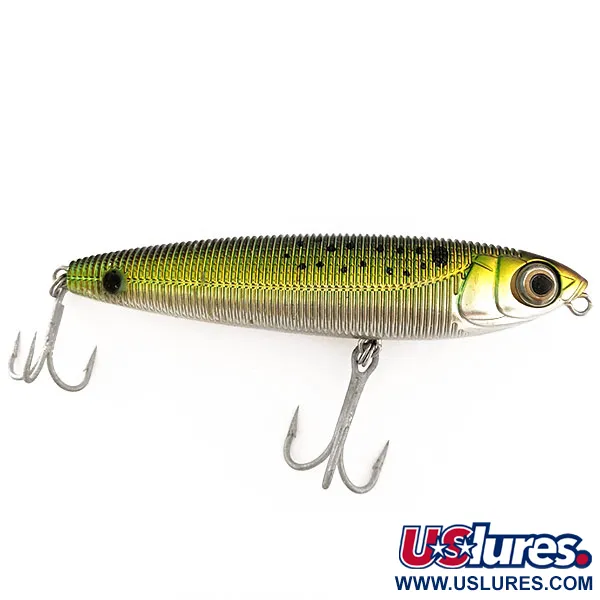 Tämän 10 cm pitkän japanilaisen pintavieheen kylkien uritettu tekstuuri on suunniteltu tuottamaan ainutlaatuinen ääniprofiili sen liikkuessa pintaa pitkin. Painoltaan 16-grammainen YO-ZURI Sashimi Pencil on rakennettu vakaaksi ja pitkäheittoiseksi avovedessä. Tuotekoodilla 11983 tunnistettavassa vieheessä on kullanvärinen väritys, joka vaihtuu visuaalisesti vihreän ja chartreusen sävyihin jäljitellen elävän syöttikalan luonnollisia sävyjä. Rakenteessa on kovaääninen sisäinen räminäkuula, ja se on luokiteltu äänityyppiseksi vieheeksi houkuttelemaan petokaloja kuten haukea, kuhaa ja ahventa. Koska kyseessä on kelluva malli, uintisyvyys pysyy pinnassa 0 metrissä. Yksilö on 5/5-kunnossa, ja siinä on säilynyt korkeakiiltoinen viimeistely, suuret 3D-silmät sekä terävät, korroosionkestävät kolmihaarakoukut. Yksityiskohtaiset kiduskannet ja tummasävyinen pääosa lisäävät profiilin realistisuutta.