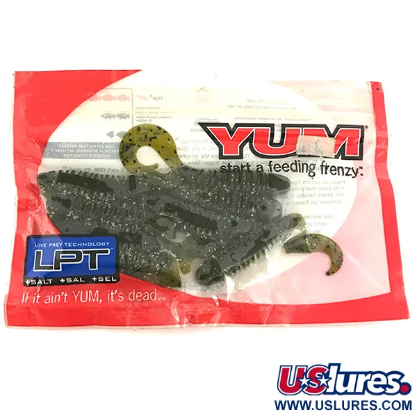 Suolakäsitelty 'Green Pumpkin' -muovi antaa näille 10 cm pitkille jigeille tiiviin ja luonnollisen rakenteen, joka kestää hyvin jigikalastuksessa. Näissä Yhdysvalloissa valmistetuissa pehmovieheissä (tuotekoodi 6893) on tunnusomainen syvään uritettu runko, joka syrjäyttää vettä ja maksimoi hajusteen tarttumispinnan. Alkuperäinen puna-valkoinen pakkaus sisältää kahdeksan käyttämätöntä yksilöä. Muotoilultaan suuri sirppipyrstö yhdistettynä voimakkaasti renkaalliseen runkoon luo klassisen profiilin pohjan lähellä pomputtamiseen tai kasvuston seassa uittamiseen. Pakkauksen LPT (Live Prey Technology) -merkintä tarkoittaa YUM:n ammattitason jigeille tyypillisiä erikoishajusteita. Tämä nimenomainen Green Pumpkin -väri tummilla pilkuilla tarjoaa luotettavan ja luonnollisen esitystavan useille eri makean veden kalalajeille.