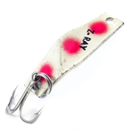 Tämä vain 1,5 gramman (3/64 oz) painoinen ultrakevyt yhdysvaltalainen lusikkauistin edustaa Z-Ray Luresin klassista finesse-lähestymistapaa. 3 cm (1 1/4") pitkässä metallirungossa on puhdas valkoinen viimeistely ja kolme selkeää punaista pistettä, jotka toimivat tehokkaina ärsykepisteinä. Tässä "Z-RAY"-leimalla varustetussa yksilössä (tuotekoodi 3364) on 4/5-kunto ja vain hieman kulumaa pinnassa. Alkuperäinen kolmihaarakoukku on kiinnitetty tukevalla uistinrenkaalla, mikä sopii täydellisesti pienten jokien taimenille tai kevyille ahvenseteille. Sen yksinkertainen stansattu metallirakenne on osoitus USA:n puolivälin vuosisadan valmistusstandardeista.