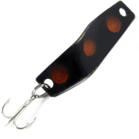Syvänmusta viimeistely toimii taustana kolmelle haalistuneelle puna-oranssille täplälle tässä 3,6 g (1/8 oz) painoisessa metallisessa lusikkauistimessa. Yhdysvalloista kotoisin oleva Z-RAY Lures käytti rungon muotoilussa erityistä kulmikasta taitosta perinteisen sileän kaaren sijaan, mikä on heidän valmistusprosessinsa tunnusomainen piirre. Varusteet ovat huomattavan siistit: hopeinen kolmihaarakoukku ja uistinrengas ovat säilyneet huippukunnossa. 3,5 cm (1 1/2") pituus tekee tästä erinomaisen valinnan heittokalastukseen pienemmissä puroissa tai lammissa, joissa suositaan kevyitä välineitä. Tässä yksilössä on tuotekoodi 3365 ja sen pinta on poikkeuksellisen hyvin säilynyt, mikä oikeuttaa 5/5-kuntoluokitukseen. Takapuoli on tasaisen musta, mikä takaa yhtenäisen profiilin eri kulmista katsottuna.