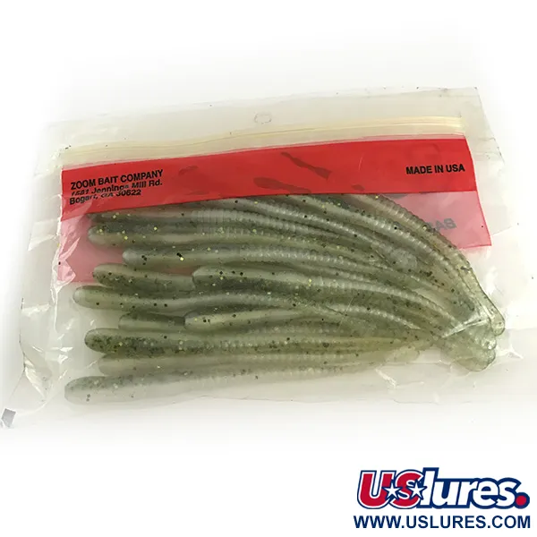 Tasan 4 tuumaa (10 cm) pitkät kapeat pehmovieheet ovat finesse-kalastajien vakiovaruste hienovaraiseen esittelyyn. Tässä Zoom Meathead -pakkauksessa (tuotekoodi 6667, merkintä 024-114) on ikoninen Baby Bass -väritys: läpikuultava vihreä pohja, jossa on runsaasti tummia ja kimaltelevia vihreitä hileitä. Vaikka alkuperäispakkauksessa lukee 20 kappaletta, tämä vintage-setti sisältää 19 käyttämätöntä viehettä, joiden alkuperäinen rakenne ja ulkonäkö ovat säilyneet. USA:ssa valmistetussa mallissa on rengastettu runko, joka muuttuu ohueksi litteäksi hännäksi – kokoonpano, jota suositaan usein drop-shot- tai split-shot-jigauksessa. Vieheet ovat käyttämättömiä ja näyttävät siltä, kuin ne olisi juuri otettu kalastuskaupan hyllyltä vuosikymmeniä sitten. Jokaisessa madossa on "Better Than Salt" -koostumus, joka mainitaan Zoom Bait Companyn klassisessa puna-keltaisessa pakkauksessa.